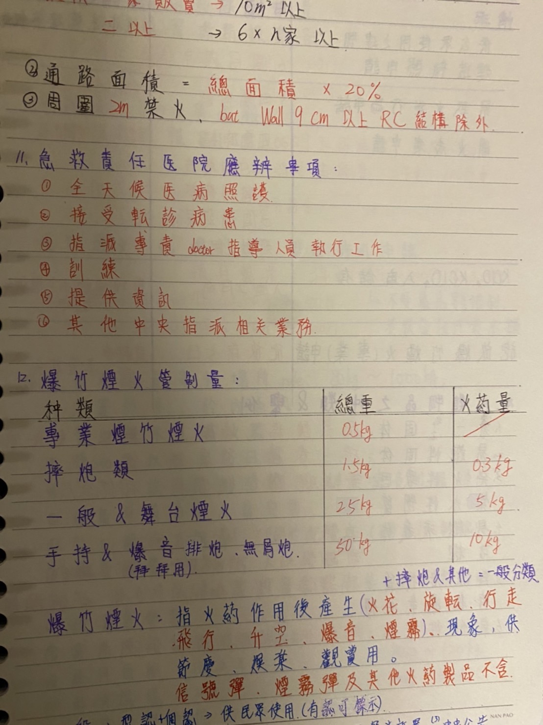 【消防與災害防救法規概要】 消防法規的部分是藉著上課時吳老師的有趣解說作為初始記憶,在課後立即將當天課堂提及的法規及相關施行細則加以朗誦。在練習考古題時, 將錯題的法規條文及其相關細則紀錄於考古錯題筆記本中,將類似法規或易搞混的法規整理在一起,而申論題的部分是利用三民輔考的教材中特別註記須加以背誦的法條作加強, 在練習考古題時也將常出現的條文加以註記,而不常出現的條文有印象即可。