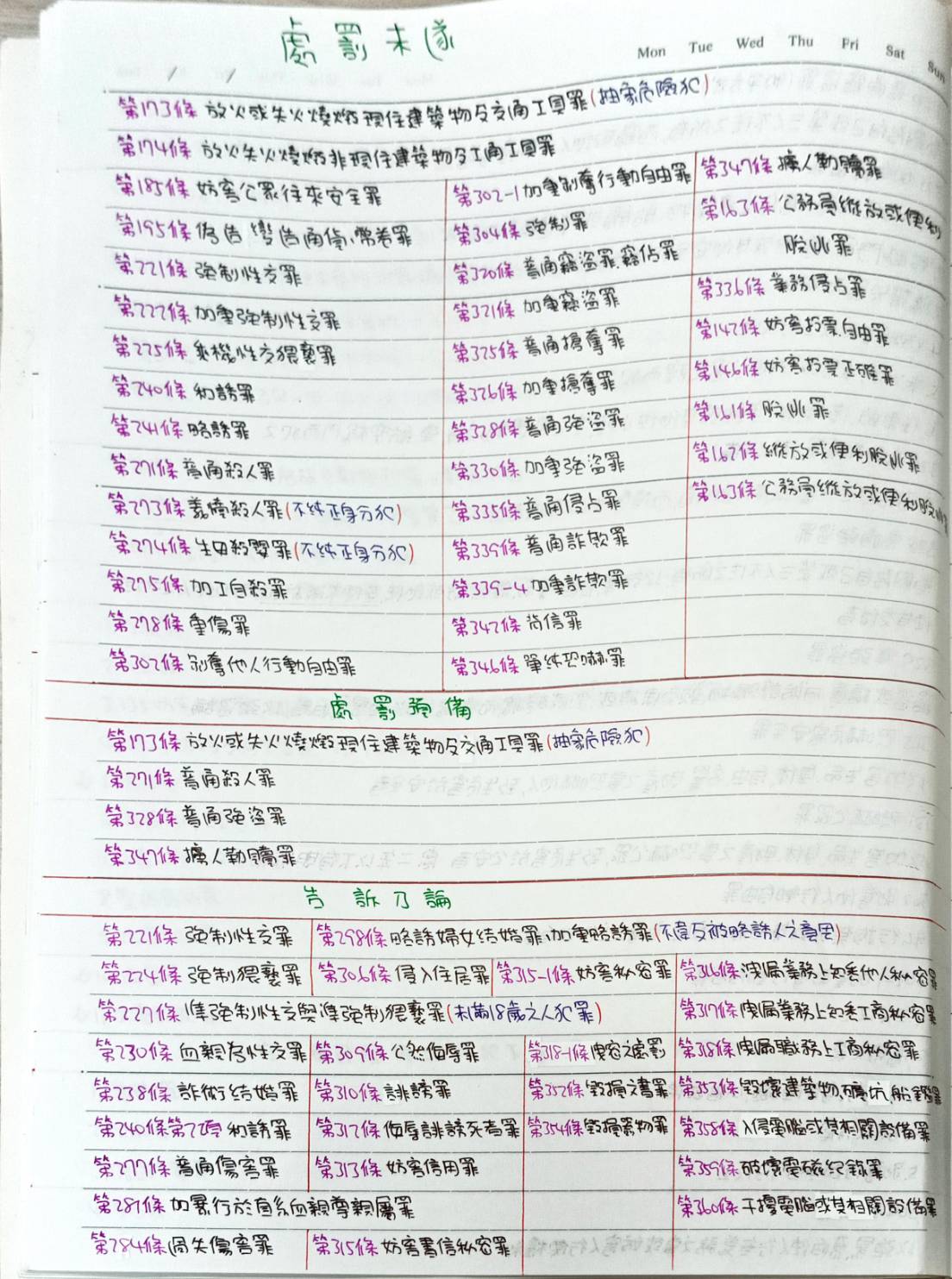 【刑法概要】 我大概都只讀補習班給的那一本小法典,因為我覺得重點都濃縮在裡面了,再加上老師上課補充的一些重點,我也會直接寫在上面, 這樣讀書的時候要對應法條也比較方便,然後刷歷屆試題也是一定要的,對完答案後,把每一個選項錯誤的地方改成正確的, 這樣對於熟悉法條也比較容易、快速。如果遇到不懂的地方,我會先試著找找看書上有沒有更詳細的解析,如果真的找不到, 我會備註起來等上課的時候問老師。考前對於這科是比較有把握的,雖然也有些很難不太懂的地方,但是幾乎只要有把法條讀熟, 要拿分其實蠻容易的。刑法這一科可以透過刷歷屆試題來做準備,然後可以準備一本筆記本把重點整理出來,多看然後熟記就可以了。