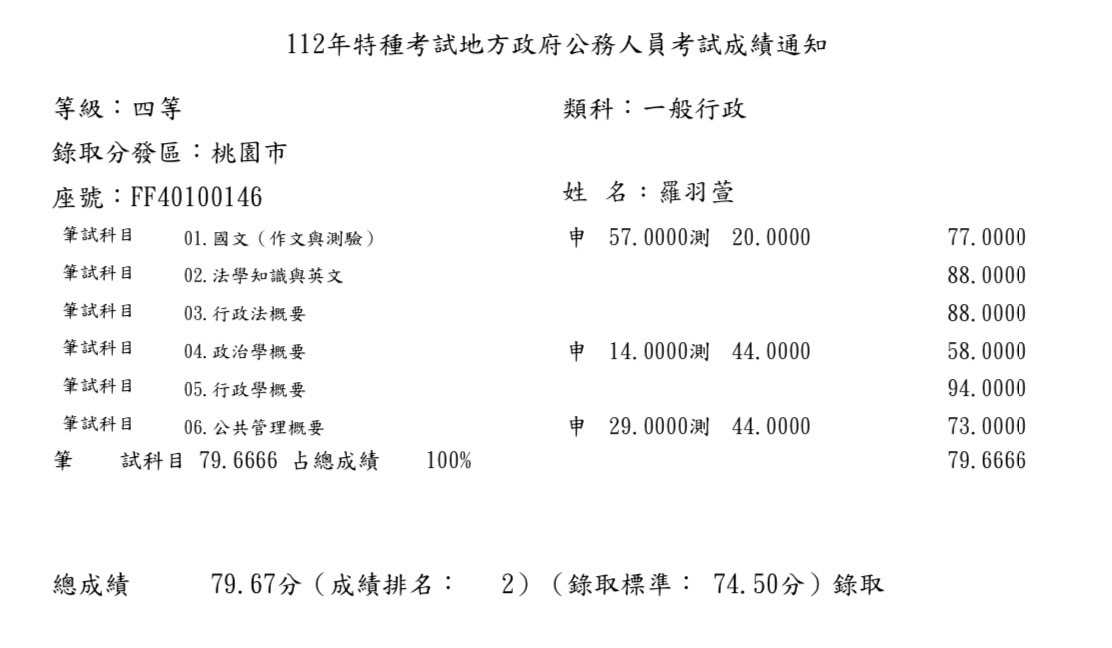 接下來就是12月的地方特考,考試前一兩個月,又對自己沒自信,差一點再次放棄,但是考上高普考的堂哥說:「如果是我,會選擇一次到位。」 所以決定搏一把。更加用心的準備,最終成就了地方特考四等一般行政的第二名。 兩年的努力,都因上榜這一刻而有所非凡的價值, 不管以後在哪一個職位,要能以準備國考時的心態毅力, 鍛鍊自己的工作能力及服務人群,並且繼續往上考,更求精進。千萬不要再因為沒自信而放棄!