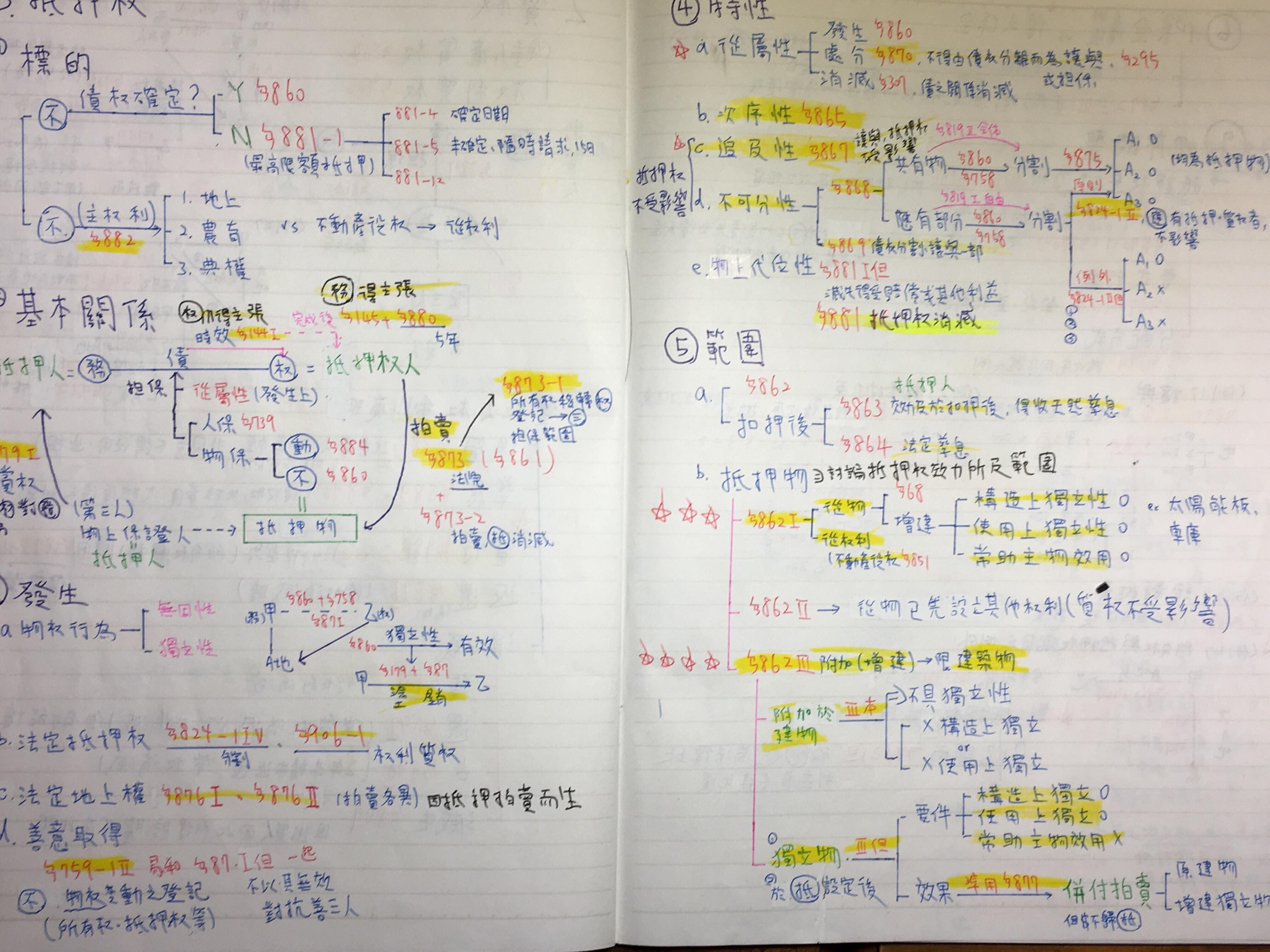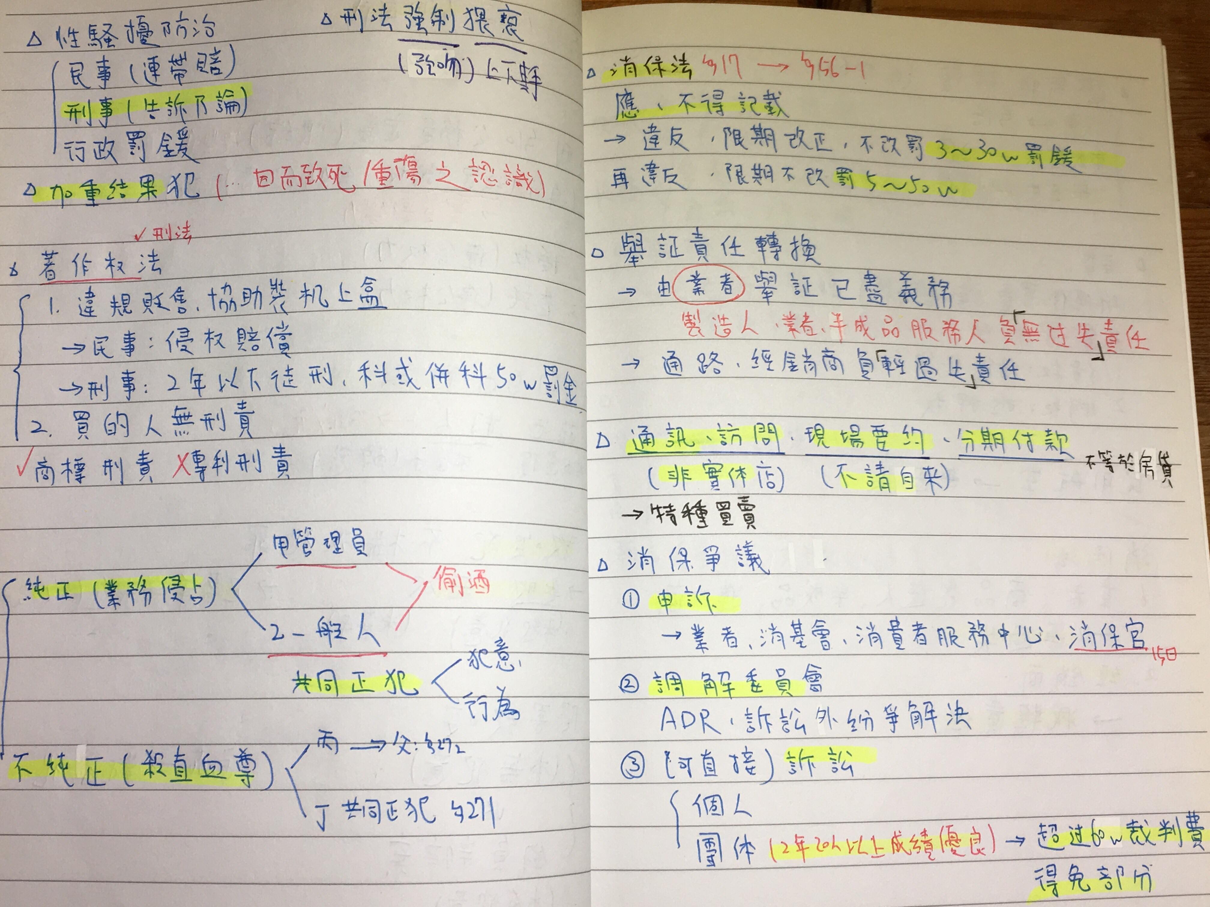 【民法概要】 民法是最深的科目,雖然有範圍但大部分都是敗在申論題,所以要有一套自己能在考場上發揮的申論方式,我不愛寫但我會去想, 將法律必用三段論法內化成自己的三段論法,我的目標是讓閱卷老師覺得我有學過民法也知道一點三段論法,這幫助我拿到了16分和15分的成績。 老師會說條號很重要,條號是基本分,且我舉比較多條號就會多拿一分。另外就是內容,如果考試無法一模一樣的寫出來,那也要將理解的部分盡量法律化的去寫。 最後民法要會觸類旁通,只要正確都是加分關鍵。