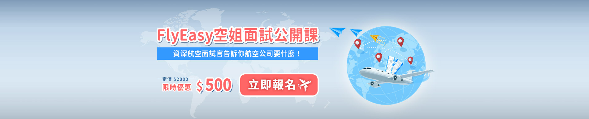 空服員招募流程快速又緊湊,各大航空公司招募,從線上報名到正式面試,往往不到一個月,若沒有提早準備,容易錯失錄取機會!最新航空招募流程、活動資訊,FlyEasy空姐英文公開課來幫你準備!