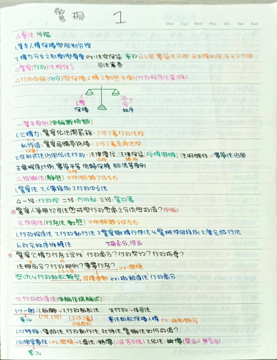 【警察法規概要】 我大概都只讀補習班給的那一本小法典,因為我覺得重點都濃縮在裡面了,再加上老師上課補充的一些重點,我也會直接寫在上面, 這樣讀書的時候對應法條比較方便。刷歷屆試題也是一定要的,對完答案後,把每一個選項錯誤的地方改成正確的, 這樣對於熟悉法條也比較容易、快速。如果遇到不懂的地方,我會先試著找找看書上有沒有更詳細的解析,如果真的找不到, 我會備註起來等上課的時候問老師。考前對於這科真的很沒有把握,因為我覺得真的蠻難的,到考前還是有很多不懂的, 但考後對完答案的時候,發現自己其實都能判斷出正確答案,沒有想像中那麼難。讀書訣竅就是要抓重點讀,不要每一個字都看, 很浪費時間也沒有意義,因為就算每一個字都看過也不可能都記的起來,可以準備一本筆記本把重點整理出來,多看然後熟記就可以了。 【警察法規概要歷屆試題】