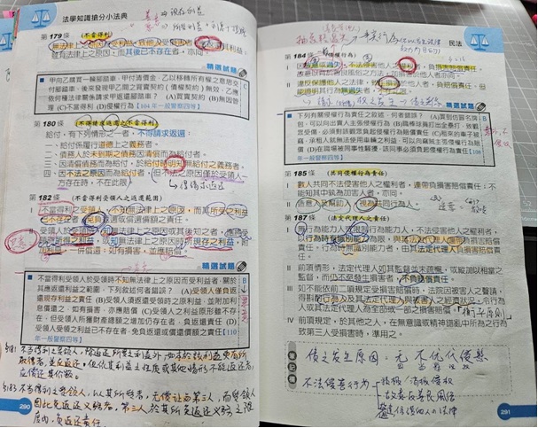 另外在常考法條前打勾,常錯法條用不同顏色的旋轉蠟筆重複做記號,錯一次畫一次,愈多顏色的代表常錯,要更加熟讀。 有些法典沒有的重點法條就自己補上,兩年下來,總共看了十幾二十遍以上(經過自己精簡及整理的重點)愈熟愈好。練習選擇題時,將自己的目標設定在90分以上。