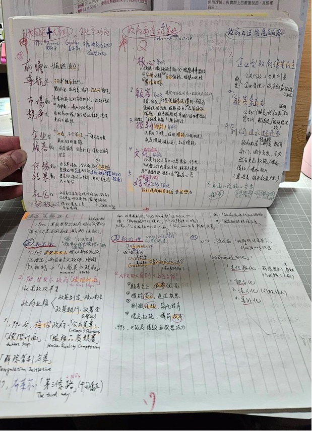 【公共管理概要】 另外寫一本重點集,把課本的重點摘錄進去。重點集內的申論部分,查詢申論歷屆試題範圍, 把可能出題的地方再擬大小標題,用口訣幫助記憶。選擇部分,所有考試類科的公共管理題目都寫, 從最新歷屆試題往回寫十年左右,重複測驗直到考試。考試當日,申論題不管遇到多沒把握的題目都一定要寫。
