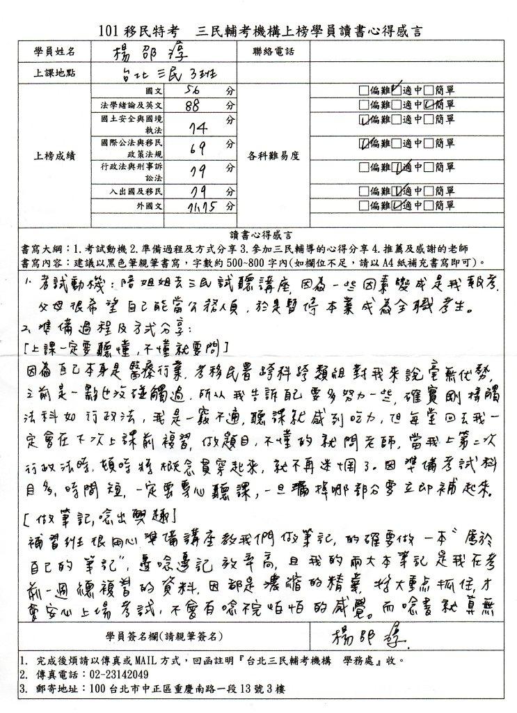 很感謝每一位老師,但特別感謝行政法、國土老師,兩位老師非常用心,上課生動內容豐富,努力幫助我們上榜,還有移民政策老師常補充很多資料、口訣、還有激勵人心的話:「上榜機率1/2,上與不上而已!」。