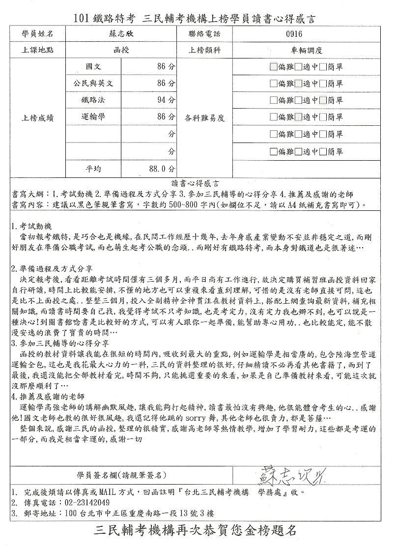 整個來說,感謝三民的函授,整理得很精實,感謝老師們的熱情教學,增加了學習耐力,這些都是考運的一部分,而我是相當幸運的,感謝一切。