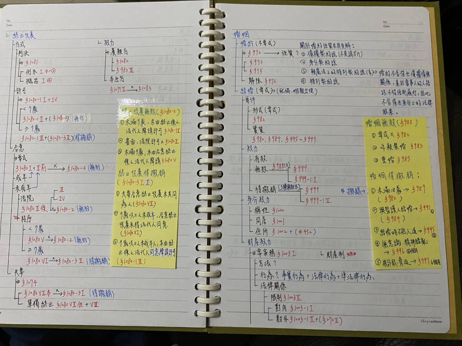 筆記方面以民法戴久喨老師為例,老師的筆記都是很有架構的,我會以老師的筆記為主,另外自己整理出例如:法定抵押權的有哪些、收養無效、得撤銷的又有哪些, 讓整份筆記更完整,自己讀的時候影能更清楚。這次備考都是以三民輔考提供的教材為主,另外可能自己再去網路上影印一些資料,例如交通政策白皮書之類的。