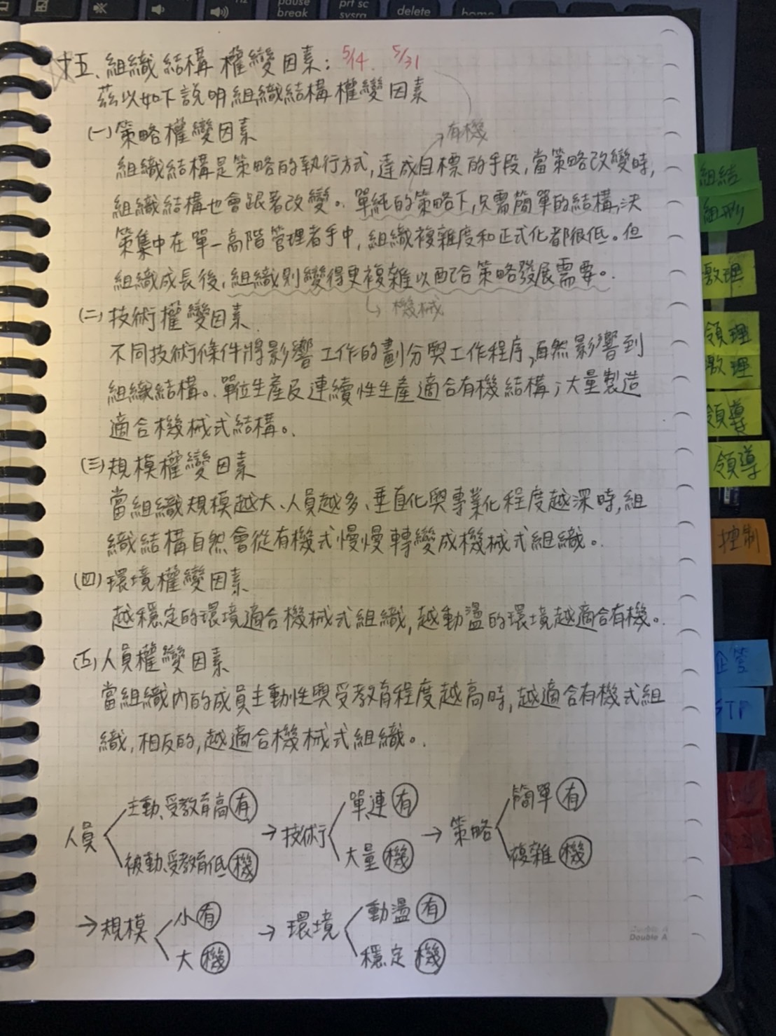 【企業管理概要】 這科是我覺得最難準備的,因為範圍很廣,所以我的方式是按照顏回老師的猜題方向去準備,在雲端課程上,老師有說哪些一定會考,哪些可以不用看, 接著就準備老師說的部份,再利用考古題來加強自己擬答,還有一些題目會很難聯想到答案有什麼,所以可以善用老師教的畫圖聯想, 這招我自己是覺得很受用,可先想出大方向,再一一的去解題。