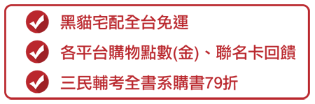 由三民補習班專業名師群親編,完整對應最新考試命題方向,詳實彙整觀念,套書內含重點整理、精選試題及歷屆試題,循序漸進研讀重點及習作試題,即能有效掌握考情趨勢及考試出題方向。
