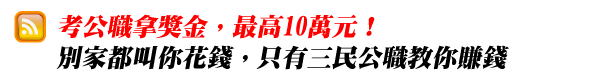 你知道嗎?補習也能賺錢!三民了解大家「沒賺錢還要拿錢出來補習」的心情,特別推出「考公職拿獎金」活動,高普考上榜獎學金遠超過補習費!榜首獎金十萬!欲知詳情請速登記參加三民公職說明會!